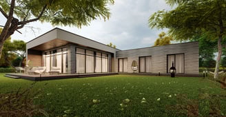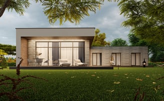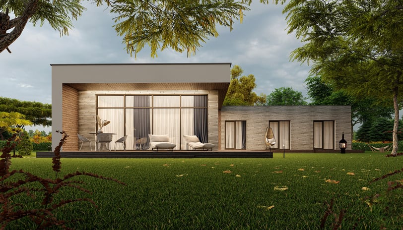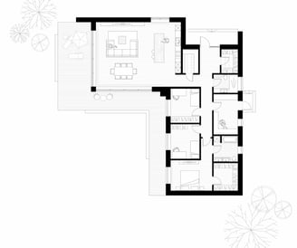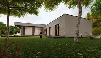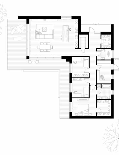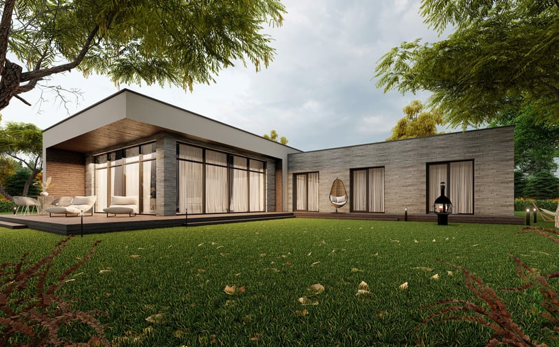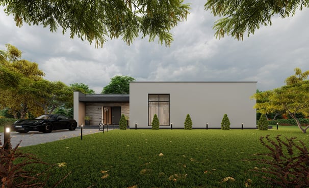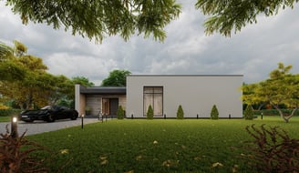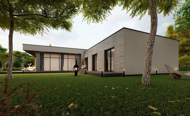 Praktiškas ir patogus L formos namas, kuriame numatyti trys atskiri gyvenamieji kambariai, virtuvė, valgomasis ir svetainė, įrengti vienoje erdvėje. Namas suplanuotas taip, kad kiekviena zona atitiktų skirtingus šeimos poreikius, tačiau tuo pačiu išlaikytų erdvės ir šviesos pojūtį.